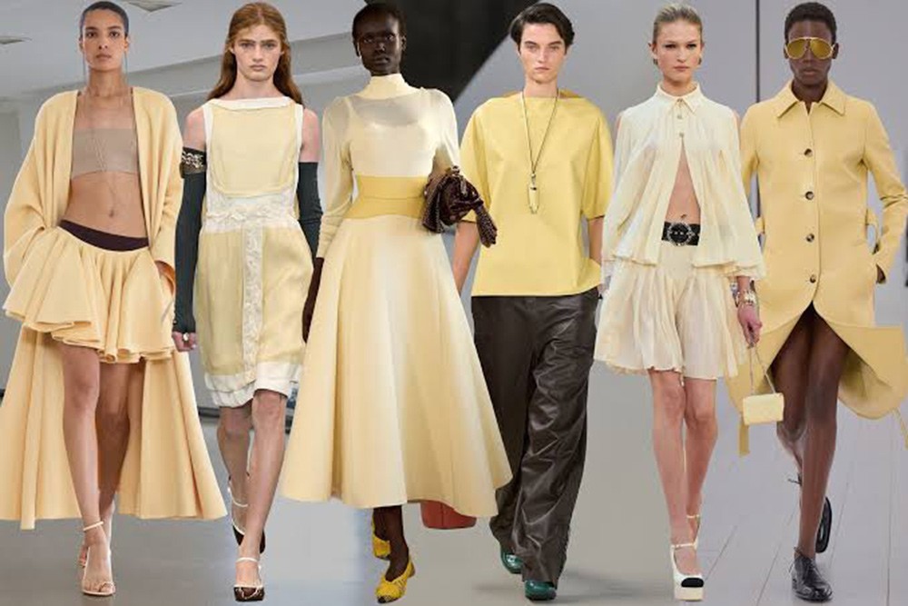 Sezonun en belirgin tonlarından biri tereyağı sarısı. Özellikle Paris ve Milano defilelerinde, tek parça görünümlerde ve akışkan kumaşlarda sıkça karşımıza çıkıyor.