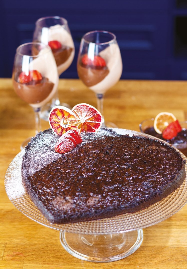 Çikolatalı ıslak kek benim favori tariflerimden biridir. Sevgililer Günü için de çok iyi bir seçim ve garanti tutar. Kalp şeklinde bir kek kalıbına döktüğünüzde ve üzerini çilek, pudra şekeri ile süslediğinizde çok güzel, insana mutluluk veren bir tatlı oluyor. Çikolatanın şehvete yönelik, kişinin enerjisini yükselten, keyif veren bir tarafı olduğunu düşünüyorum. Bir de aşk kadehleri hazırladım. İki renk çikolatadan yapıyoruz pembe ve siyah çikolatan oluşan muhallebi. Çiftlerden hangisinin sevgisi öbürüne daha baskın geliyorsa üstteki kat onun olsun diyorum.