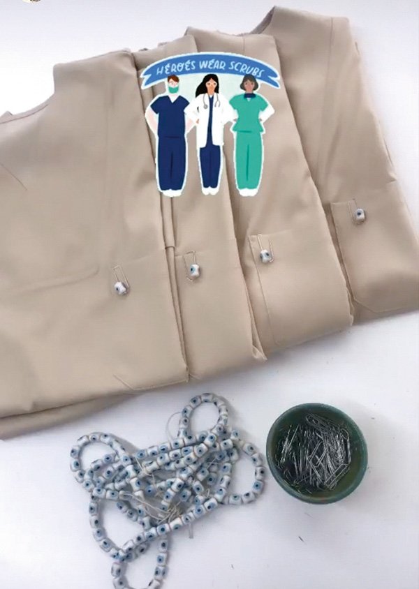 Nazar boncuğu, sağlık çalışanlarımız için hem kültürümüzden hem de cidden gönlümüzden gelendi. Çok zor şartlarda çalışıyorlar, biz evde bile kalmaktan şikayet ederken, onlar çocuklarını evde bırakıp salgınla, ölüm riski ile boğuşuyorlar. Bir nazar boncuğunun daha gerçek kullanıldığı bir yeri görmedim. Atölyeye isimsiz gelen nazar boncukları tam bir film sahnesi gibiydi. Biz de ürettiğimiz üniformalara imzamızı atmıyor veya etiketimizi koymuyoruz ve Türkiye'nin çeşitli illerinden isimsiz gelen nazar boncuklarını takıyoruz. Bir nevi "Adımız yok ama hep birlikteyiz" der gibi…