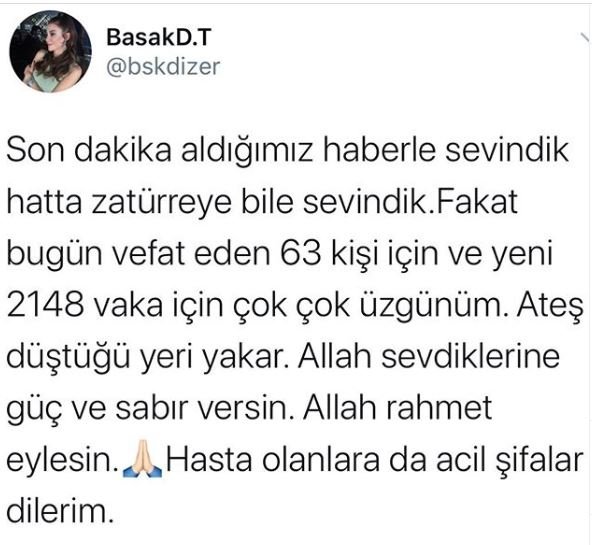 42 yaşındaki stil danışmanı, Instagram hesabından yaptığı açıklamada "Son dakika aldığımız haberle sevindik hatta zatürreye bile sevindik. Fakat bugün vefat eden 63 kişi için ve yeni 2148 vaka için çok üzgünüm. Ateş düştüğü yeri yakar. Allah sevdiklerine güç ve sabır versin. Allah rahmet eylesin. Hasta olanlara acil şifalar dilerim" dedi.