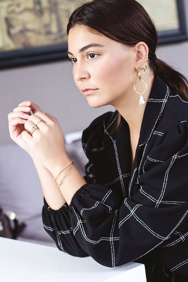 Yeni koleksiyonumda markamın imzası haline gelen inciyi, geometrik formlarla birleştirmek istedim. Beyaz ve kahverengi pırlantayı hem inciyle hem de karartılmış cila detayları olan altın parçalarla kullandım. Modern ama geçmişten ilham alan; gündüzden geceye taşıyabileceğiniz; zamansız bir koleksiyon oldu. Yazın daha feminen ve hareketli olan tarzım, kış aylarında kendini biraz daha düz ve klasik parçalara bırakıyor.