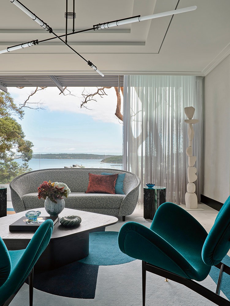 Yaşam alanlarında kullanılan mermer ve kuvarsit levhalar, yüzeyleri canlı renk çizgileriyle hareketlendiriyor, heykelsi sakinliğe dinamizm katıyor. Sidney limanının ışıltılı manzarasına karşı konumlanan residence, iç-dış mekân sürekliliğini öne çıkaran akışkan bir yaşam düzeni sunmakta.
