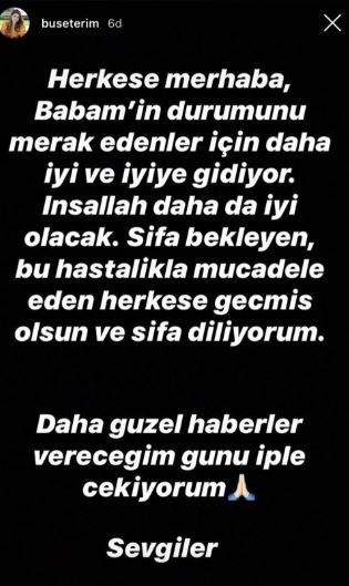 Buse Terim, sosyal medya hesabından yaptığı son paylaşımda "Herkese merhaba, babamın durumunu merak edenler için daha iyi ve iyiye gidiyor. İnşallah daha da iyi olacak. Şifa bekleyen, bu hastalıkla mücadele eden herkese geçmiş olsun ve şifa diliyorum. Daha güzel haberler vereceğim günü iple çekiyorum" ifadelerine yer verdi.