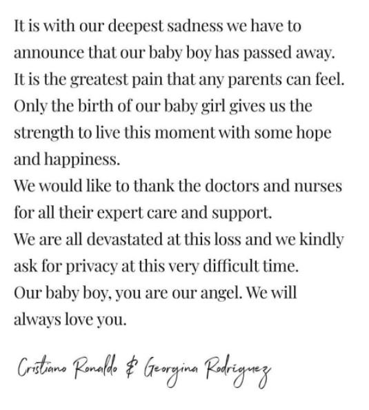 Portekizli futbolcu Instagram hesabından yaptığı paylaşıma, "Bu, bir anne ve babanın yaşayabileceği en büyük acı. Kızımızın doğumu bize şu an güç, umut ve mutluluk veriyor. Canım oğlumuz, sen bizim meleğimizsin. Seni her zaman seveceğiz" notunu düştü.