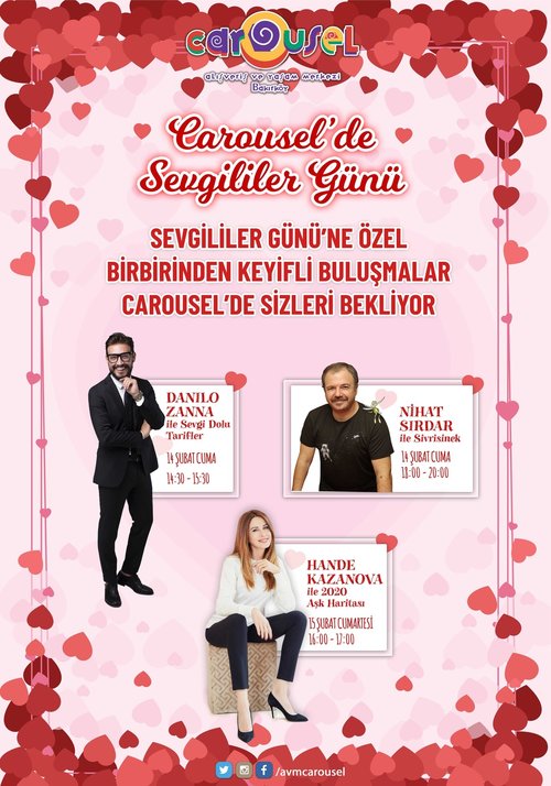 Alışverişin keyifli ve huzurlu adresi Carousel Alışveriş ve Yaşam Merkezi, her yıl olduğu gibi bu yıl da 14 Şubat Sevgililer Günü'nde birbirinden eğlenceli etkinliklere ev sahipliği yapıyor. Ünlü İtalyan Şef Danilo Zanna ile Sevgi Dolu Tarifler Atölyesi, Nihat Sırdar ile Sevgililer Günü özel yayını ve Hande Kazanova ile 2020 Aşk Haritası, 14 Şubat Cuma ve 15 Şubat Cumartesi günlerinde ziyaretçilerini bekliyor.