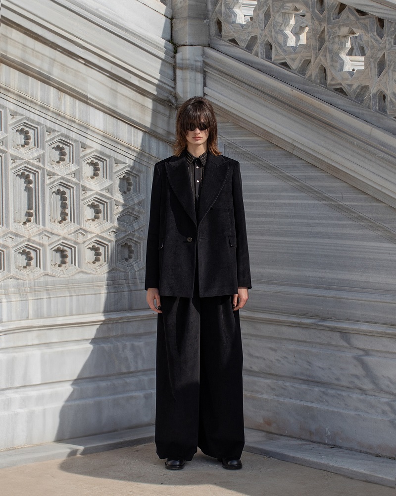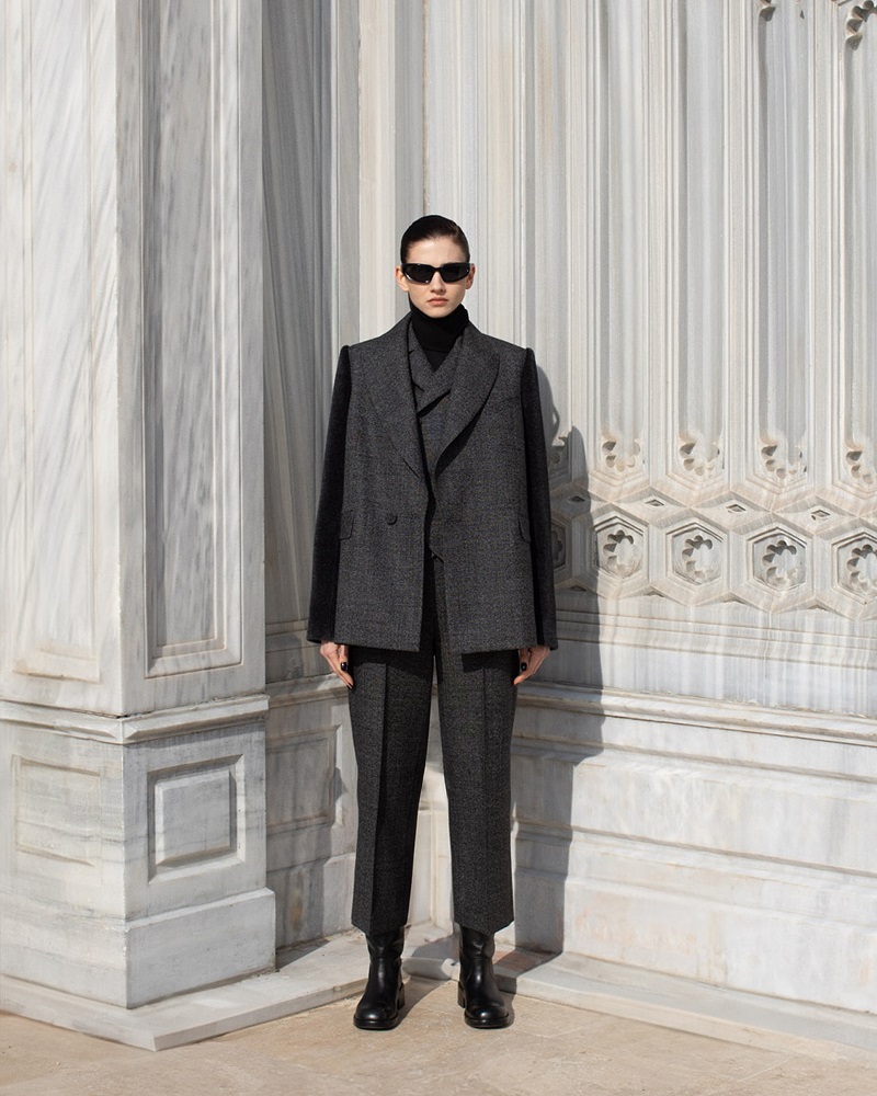 Maskülen çizgilerin de yer aldığı, zamanın ötesinde bir zarafete sahip Dice Kayek Sonbahar/Kış’23-24 koleksiyonunda, Boğaz’ın emsalsiz ruhunu yansıtan yün ve ipek flanelden paltolar, ceketler, yelekler, 30'lu yıllardaki gibi askılı olarak giyilebilecek yüksek belli pantolonlar, cigarette pantolonlar, mini etekler öne çıkıyor. Dice Kayek’in imzası haline gelen boyutlu kumaşlar, saten, ipek, kadife, brokar ve krep ve kumaşların yanı sıra el nakışı detaylar ve işlemeler dikkat çekiyor.
