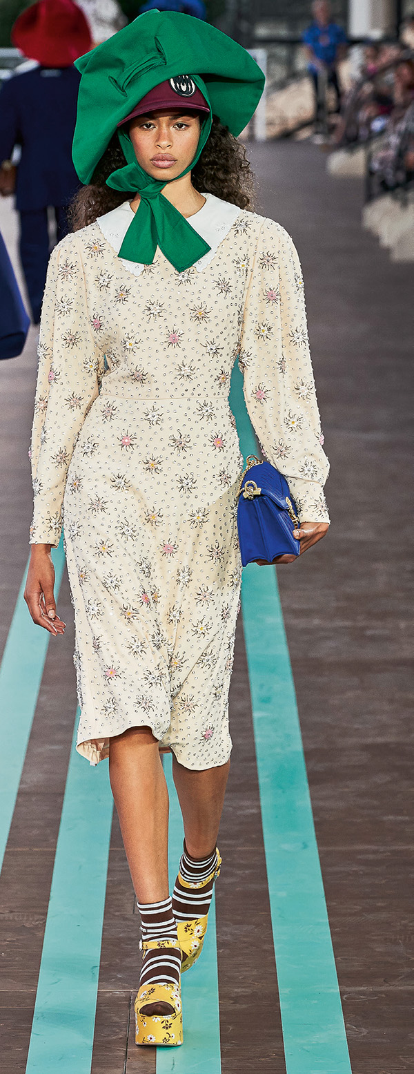 Miu Miu cruise defilesi için lokasyon seçimini klasiklerden olan Paris'te yaptı ancak mekan seçimi oldukça farklıydı. Bois de Boulogne'daki Hipodrom d'Auteuil'da gerçekleşen defilede modeller yemyeşil bir arka planda tasarımları tanıttı. Kabarık kolların, Chelsea yakaların ve jokeylerden ilham alan detayların öne çıktığı koleksiyonda özellikle şapka tasarımları dikkat çekiciydi. Abartılı kesimlere sahip şapkalar, Ascot'un abartılmış versiyonu tadındaydı.