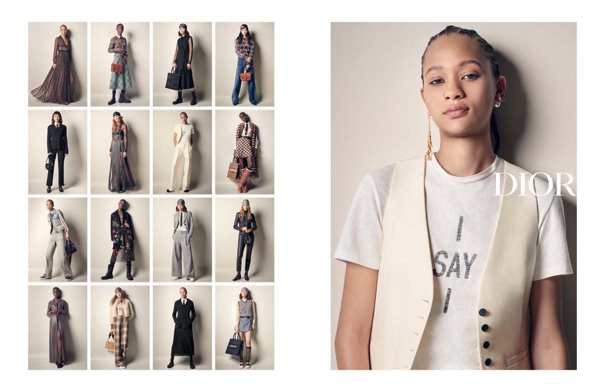 İddialı çekicilik Dior Book Tote, Lady D-Lite ve Dior Bobby çantaların kadife versiyonlarıyla ve sembol haline gelen şallarla vurgulanıyor. Tişörtlerde görülen manifesto niteliğindeki "I say I"* (Ben, ben derim) ifadesi defilenin set tasarımına atıfta bulunurken; aynı zamanda feminen gücü çağrıştırıyor.