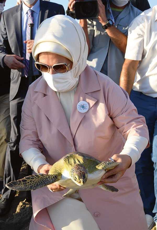 Emine Erdoğan ile Çevre ve Şehircilik Bakanı Murat Kurum, '2020 Patara Yılı' kapsamında Patara Antik Kenti'ni ziyaret etti. Gezinin başında Bakan Kurum'un davetlisi olarak Patara Deniz Kaplumbağaları Koruma ve İzleme Programı'na katılmak üzere Patara Sahili'ne gelen Erdoğan, Türkiye'nin Akdeniz sahillerinde yaşayan deniz kaplumbağalarını anlatan bir video izledi. Erdoğan, daha sonra Çevre ve Şehircilik Bakanlığı'nın yürüttüğü Patara Deniz Kaplumbağaları Koruma ve İzleme Programı hakkında bilgi aldı. Uydu takip cihazı takılan üç deniz kaplumbağasından birisine 'Belkıs' ismini veren Erdoğan, 'Belkıs' ile birlikte Çevre ve Şehircilik Bakanlığı'nın 'Patara' ve 'Likya' adını verdiği kaplumbağaların denizle kavuşması etkinliğine katıldı. Kaplumbağalardan birisini doğal yaşam alanına kucağında taşıyarak bıraktı.