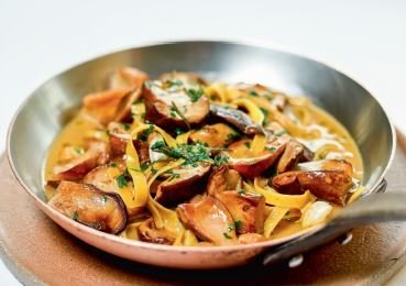 Mantarları ortadan ikiye bölüyoruz, sarımsak, biberiye ve zeytinyag ile fırınlıyoruz. Fırından çıkardıktan sonra, tavuk suyu, taze baharatlar ve tereyag ile sosunu hazırlıyoruz. Servis ederken içerisine ev yapımı tagliatelle makarnamızı ekliyoruz ve Fransız bakır tavalarda servis ediyoruz.