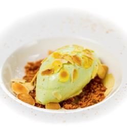 Bahçemizin incir agaçları içerisinden yaprakları en iyi kokan tek bir agacın yapraklarını manda kaymaklı dondurma harcımızın içerisine karıstırıyoruz ve dondurma haline getiriyoruz. Tabaklarken, bademli tarçın kıtırı, fırınlanmıs badem yaprakları, deniz tuzu, erken hasat zeytinyagı ve tarçın rendesi kullanıyoruz.