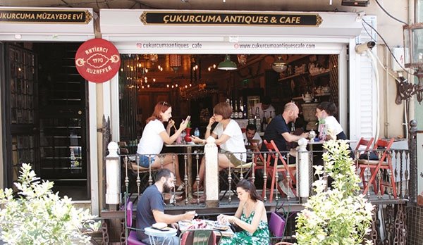 Orta Avrupa eseri olan bin 800 sonlarına ait çini kaplı kuzine üzerinde Türk kahvesi servisi ile 19. yüzyıl Fransız marka şekerliklerle 19. yüzyıl Fransız ve İngiliz takımlarda çay içmek unutulmaz deneyimlerin başında geliyor. Tüm bu deneyim sırasında mekanı zenginleştiren antika objeler, konukları tarihi bir yolculuğa çıkarıyor. Bin 800 sonlarına ait Edremit işi ferforje ile çevrili balkon ve 3. kattaki teras ise açık hava keyfi yapmak isteyenlerin gözdesi oluyor. Çukurcuma Antiques & Cafe'de bulunan 18. yüzyıla ait 12 kişilik meşe masa ve üst kattaki bin 800 sonlarına ait İstanbul işi sedirlerle çevrili alan, grupları rahatlıkla ağırlıyor. Tarihi bir deneyim sunan Çukurcuma Antiques & Cafe'de isteyenler antikalar hakkında bilgi edinebiliyor ve hatta beğendikleri objeleri satın alabiliyor.