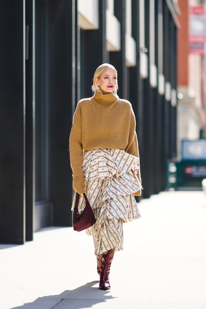Midi ve uzun boy eteklerin tüyler, püsküller, katmanlar ve ışıltılar gibi öne çıkan detaylara sahip modellerini tercih edin. Hareket ön planda olsun. Balıkçı yaka trikolar, düz tişörtler veya sivri burun topuklularla eşleştirebilirsiniz.