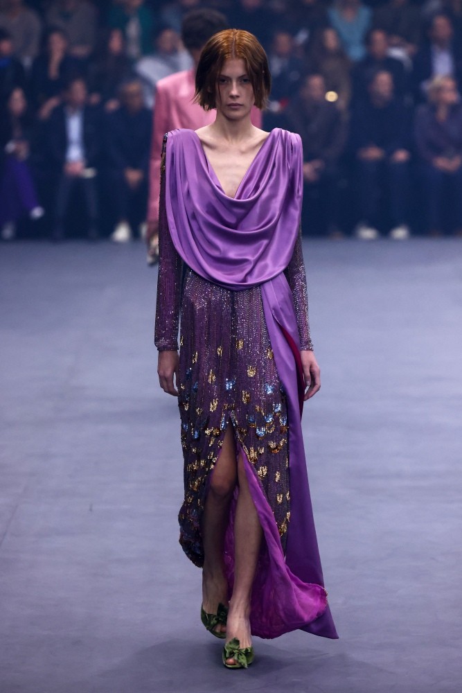 Yumuşak lavanta moru, günlük tulumlar, ceket-etek takımları ve özellikle parlak gece kıyafetlerinde öne çıkarken romantizm ve feminenliğe vurgu yapıyor. Sezon podyumunda ise baştan aşağı tek renk görünümlerle ortaya çıkıyor.