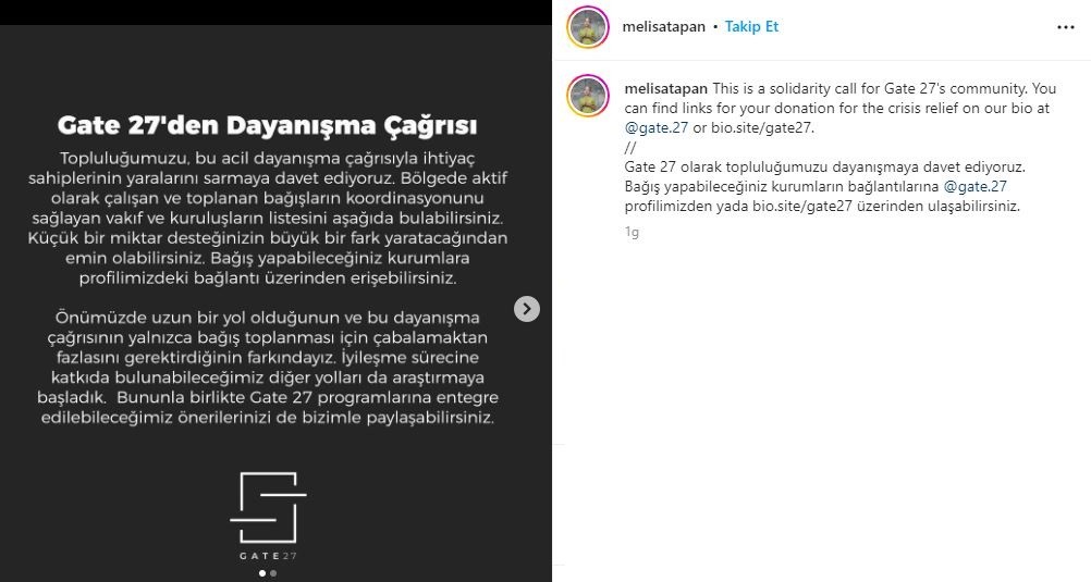 Aynı zamanda Gate 27'den dayanışma çağrısında bulundu ve hesabın üzerinden bağış yapabilecekleri bir adres de bıraktı.