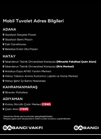 Depremin ardından ünlüler seferber oldu. Bu isimlerden biride Sabancı Ailesinin genç temsilcilerinden Melisa Tapan. Uluslararası konuk sanatçı programı Gate 27 ile iş hayatına atılan genç iş insanı Melisa Tapan, Gate 27'nin hesabından Sabancı Holding ve Sabancı Vakfı'nın deprem bölgesindeki vatandaşlarımızın konaklaması için açtıkları kurumların ve hijyen ihtiyaçları için kurdurduğu 100 adet mobil tuvaletin adres bilgilerini paylaştı.