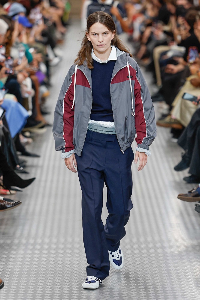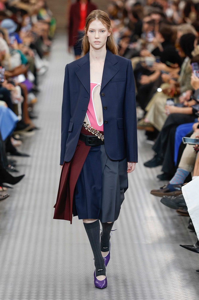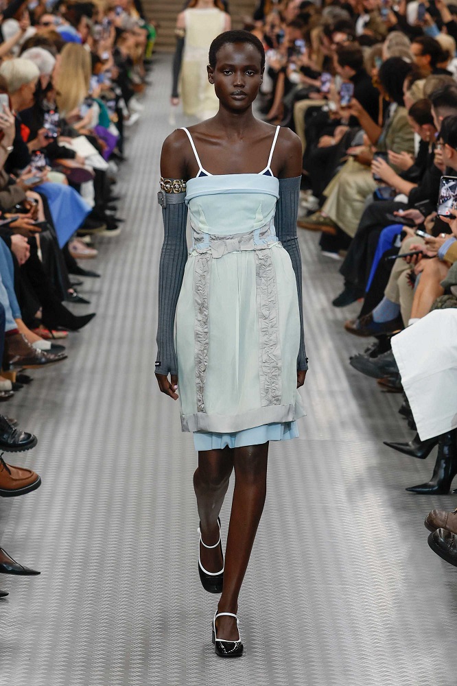 Farklı bileşenler yer değiştiriyor ve bir dürtüyle bir araya geliyor. Nesneler ve unsurlar başka şeylere dönüşüyor, yer değiştirmelerinin sonucu olarak, amaçları ve gerçeklikleri değişiyor. Parçalar, farklı bileşenler arasında geçiş yapıyor ve naylon gibi görünen nesneler ipek oluyor. Geleneksel tasarımların modern yorumlarla alışılmış olanı bilinçli bir şekilde değiştirilmesine vurgu yaparken, Miu Miu estetiğinin kendi başına bir sanat olarak öne çıkmasını sağlıyor. Bu, yavaş yavaş oluşturulmuş ve artık tam olarak gerçekleştirilmiş bir Miu Miu üniformasıdır.