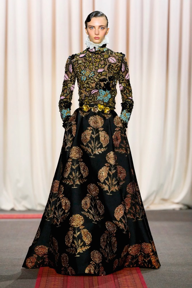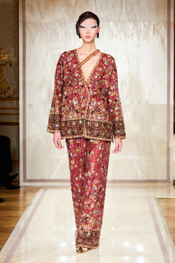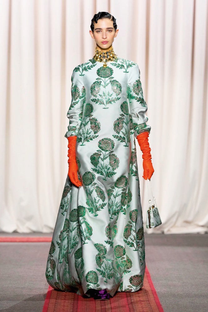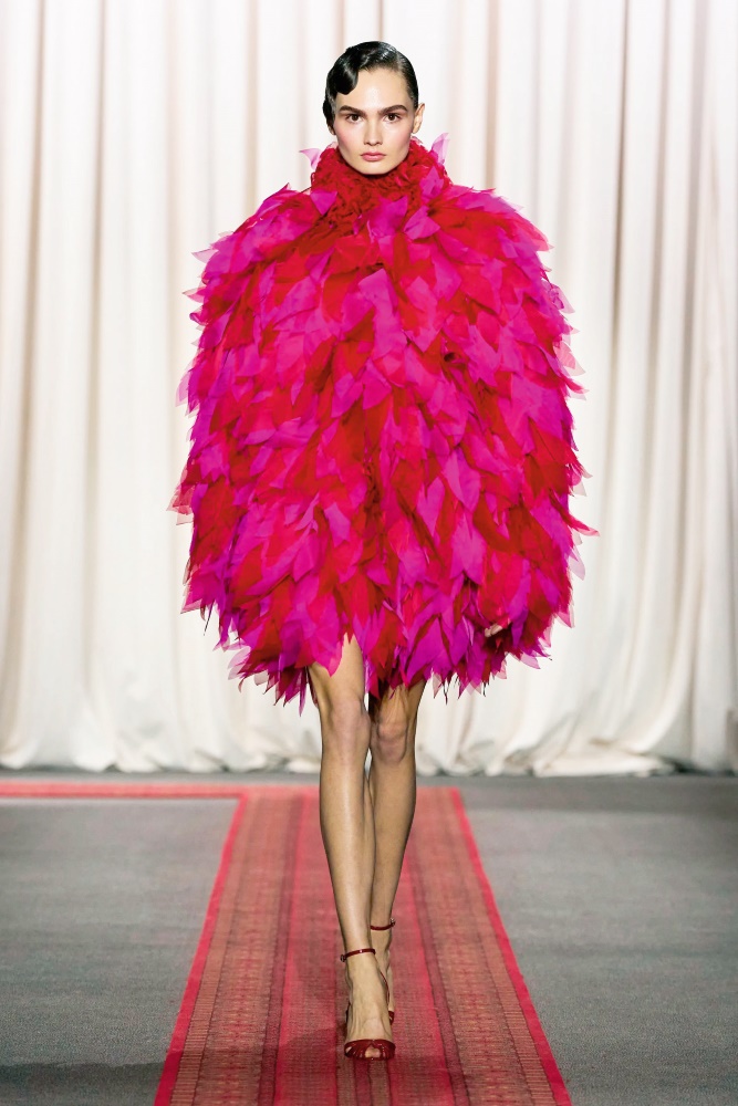 Devasa etekler, yürüyen birer sanat eseri gibi podyumda yer aldı. Mor, mavi tonları, ateş kırmızısı ve pudra pembesi gibi renkler, koleksiyona çarpıcı bir hareket kattı. Valli’nin couture dünyasına kattığı en önemli öğe, ihtişamlı siluetleri ve gösterişli tasarımlarına kattığı duygusal hikayeler oldu.