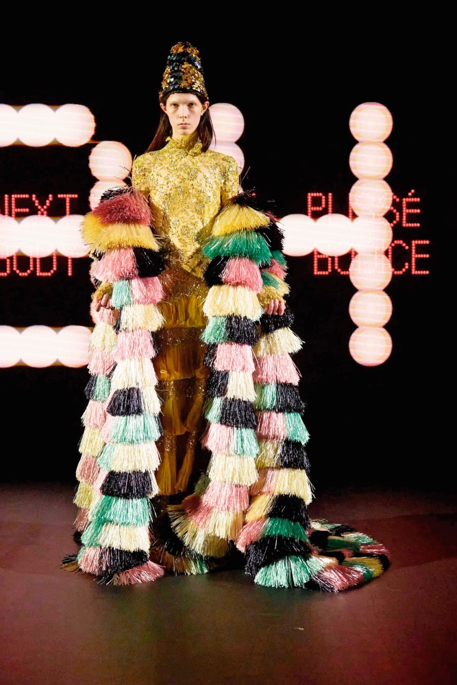 Punk esintili mohawk türü tüy başlıklar ve bambu kafes etekler, organza, dantel ve rafyadan işlenmiş çiçekler ve kelebeklerle bezenmişti.