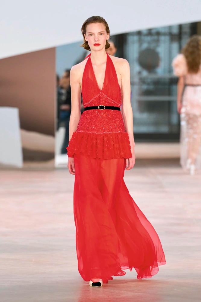 Çarpıcı parçalar arasında, kumaş şeritlerden oluşturulmuş geometrik formlar ve işlemeler öne çıkan detaylardı. Valentino Garavani’nin kırmızı tonları, fırfırlar ve piliselerle klasikleşmiş DNA’sı, Michele’in elinde yepyeni ve dinamik bir yorum kazandı.