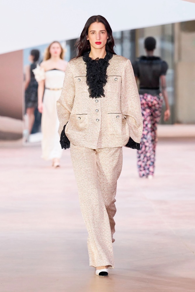 Siyah transparan elbiseler ve gece mavisi pullu elbiseler, Coco Chanel’in özüne bir saygı duruşuydu. Hafif tüy detayları ve fiyonklar, koleksiyona naif bir zarafet katarken, ışık oyunlarıyla gün doğumundan geceye uzanan bir hikaye anlatıyordu.