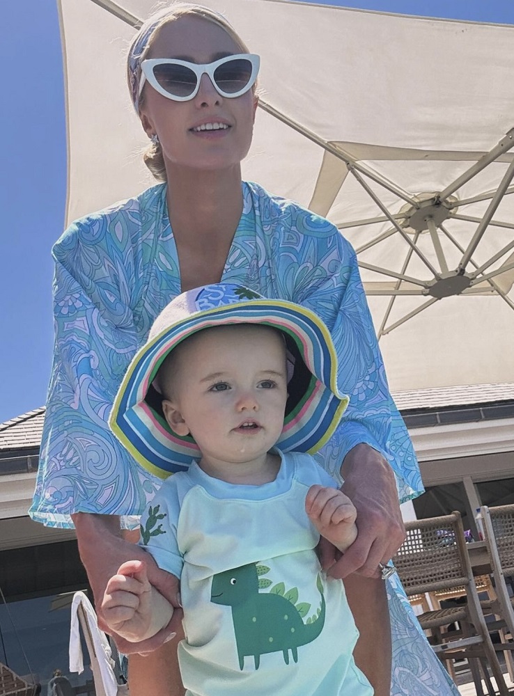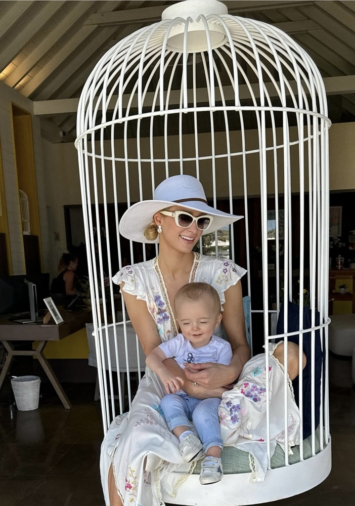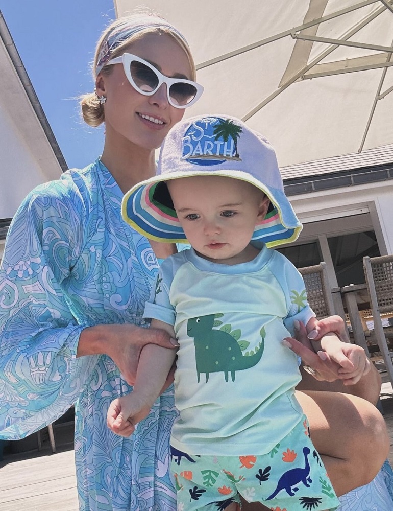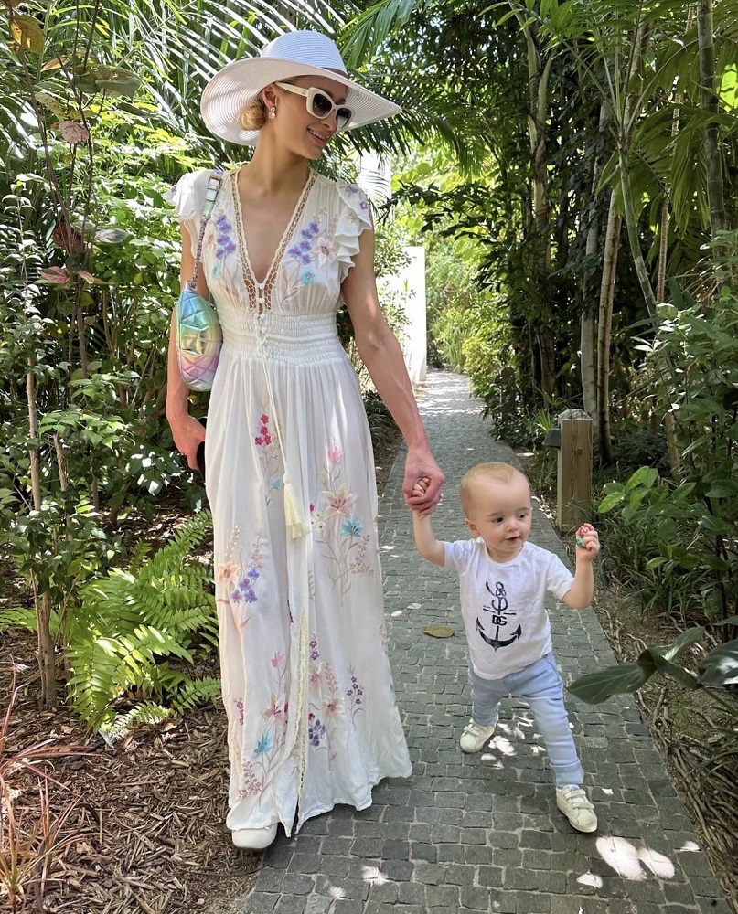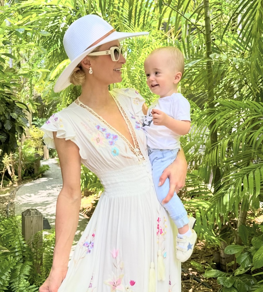 "Hayat çok güzel, bebek P (Phoenix) ile cennette" notlarıyla tatilden özel anlarını paylaşan Paris Hilton, 1995 yılından bu yana plaj modasına yön veren Türk asıllı tasarımcı Melissa Odabash imzası kaftan ve şapka tercih ediyor.