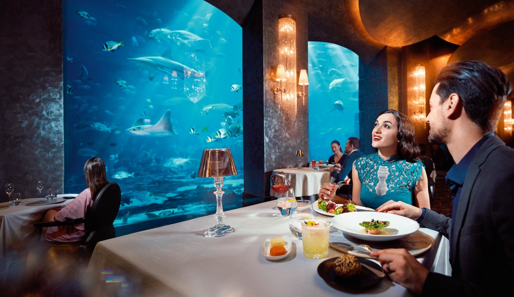 Dünyanın en büyük akvaryumlarından birine manzarası olan MICHELIN yıldızlı Ossiano restoranı, Atlantis The Palm’da, Dubai’nin en popüler romantik mekanlarından biri. Akvaryumdaki vatozlar, köpekbalıkları ve balıklar masanızın hemen yanından geçerken, şık bir yemek deneyimi vadediyor. Burj Khalifa’nın 122. katında 442 metre yükseklikte yer alan dünyanın en yüksek restoranı At.mosphere, Modern Fransız mutfağının lezzetlerini tatmanın yanı sıra, muazzam gün batımlarının keyfini çıkarmaya davet ediyor