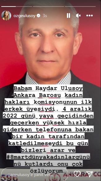 "Babam Haydar Ulusoy, Ankara Barosu Kadın Hakları Komisyonu'nun ilk erkek üyesiydi. 4 Aralık 2022 günü yaya geçidinden geçerken, yüksek hızla giderken telefonuna bakan bir kadın tarafından katledilmeseydi bugün bizleri arar ve 8 Mart Dünya Kadınlar Günü'nü kutlardı. Onu çok özlüyorum..."