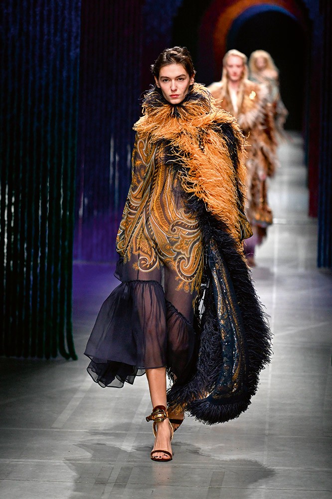 Etro, 2026/27 sonbahar/kış koleksiyonunda ailenin kültürel mirasını, geleneksel desenlerle çağdaş dokular arasında bir diyalog kurarak yansıttı ve sezonun ana temalarından birini “ev ve aidiyet” olarak yorumladı. Paisley deseni, lüks yünler, velurlar ve kadifelerle birleşti. Bu desenler, zengin tonlar ve yumuşak katmanlarla birlikte güçlü bir kişisel ifade sundu. Koleksiyon, seyircide nostaljik bir sıcaklık hissi uyandırırken aynı zamanda modern çizgilerle güncel bir enerji taşıdı.