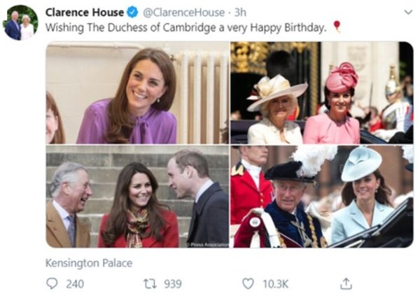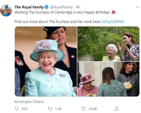 Bunun yanı sıra Kraliçe 2. Elizabeth ve Prens Charles'ın resmi Twitter hesaplarından da Düşes'in yeni yaşını kutlayan mesajlar paylaşıldı.