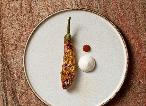Patlıcanları fermente ederek patlıcan tarhanası haline getiriyoruz. Toz haline gelmis tarhanayı likit bir forma dönüstürüyoruz. Adana'nın bostan patlıcanlarını soyup dograyıp ovuyoruz. Birçok özel sürecin ardından 170 derecede 5 dakika fırınlıyoruz. Bu patlıcanları kiraz talası ve kömürle tütsülüyoruz. Islendikten sonra pudra sekeri dökerek üzerini daglıyoruz, Sichuan biberi ve kapariyle ekleyip Manda sütü, manda yogurdu, sarımsak suyu ve tuzu koyup tabakta patlıcanla beraber sunuyoruz.