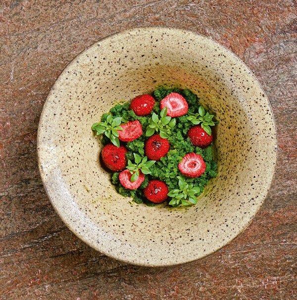 Çok kısa bir sezonu olan dag çilekleri ızgarada tütsülenir ve haif renk alır. Çilegin hassas kısımları ise ayıklanıp çilek suyu yapmak için ayrılır. Manda sütünden yapılan yogurt biraz süzülür ve mereng yapılır. Ferahlıgı dengelemek için feslegenden kar yapılır. Tüm ürünler tabakta birlestirilir. Mereng tabagın en altına konulur ve pürmüzle haif yakılır. Üzerine dag çilekleri ve çilegin öz suyundan elde edilen çilek sosu da ilave olur. Tabagın en üstüne mini feslegen yaprakları ve kurutulmus (freze dry) çilek parçaları ilave edilir.