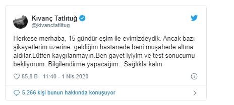 2 haftadır sosyal izolasyon uygulayan Tatlıtuğ kendisini iyi hissetmediği için kontrol amaçlı hastaneye gitti. Tedaviye alınan Tatlıtuğ, sağlık durumuyla ilgili sosyal medya hesabından açıklama yaptı.