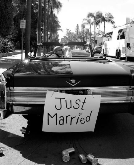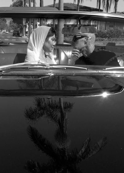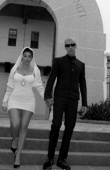 46 yaşındaki Barker törene tamamen siyah bir takım elbise, Kardashian ise törene beyaz mini bir elbise ile katıldı. Çift, "Yeni evli" yazan eski model siyah üstü açık bir arabayla törene geldi.