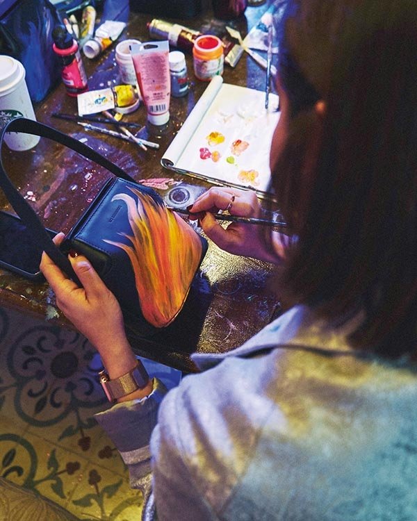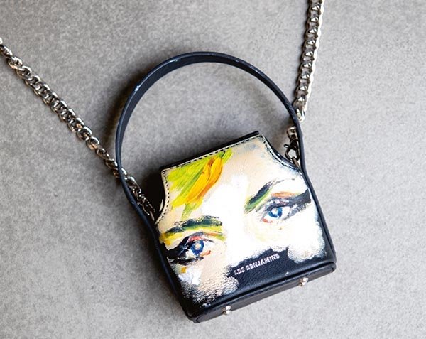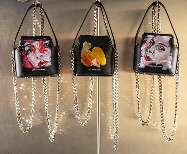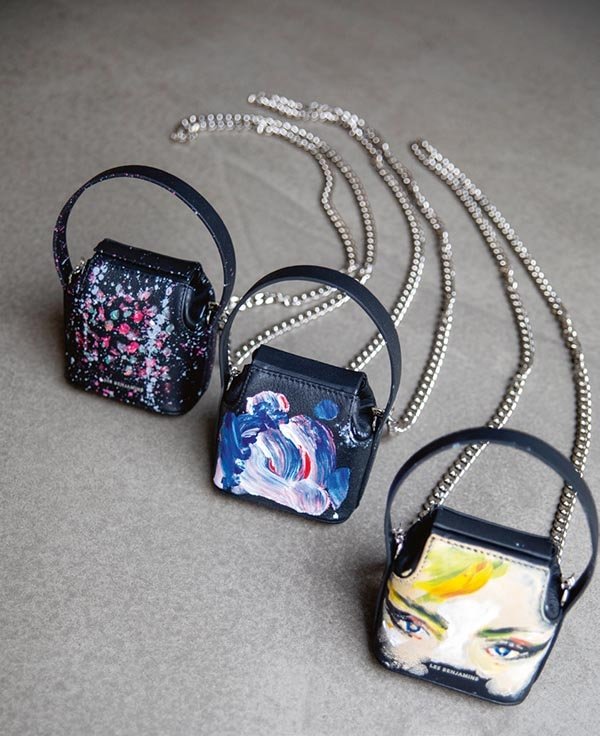 Sedef G: Les Benjamins'in yeni tasarım çantaları üzerine yağlı boya, akrilik ve farklı ek malzemeler kullanarak günlük tasarım objelerine sanatsal bir dokunuş ekledim. Her bir parçadan yalnızca bir adet bar. Genelde eserlerim büyük ebatlarda olduğundan, 2 metreye sığdırdığım bir portreyi 'micro bag'ler üzerine boyamak da detaycı ve farklı bir deneyim oldu benim için.