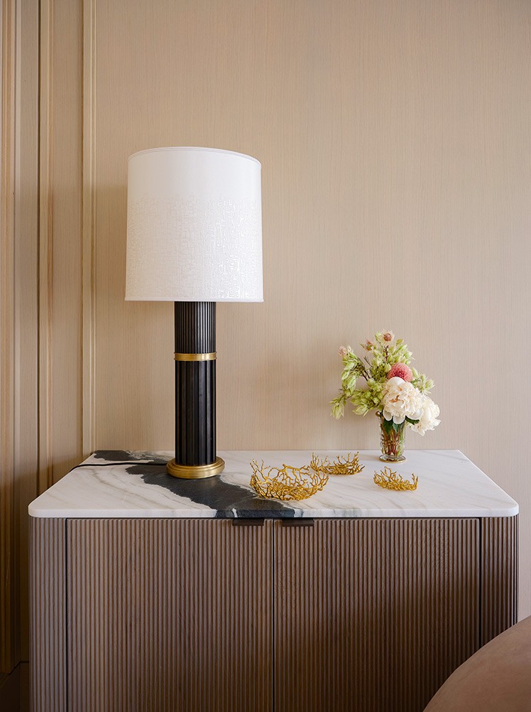 Yemek alanında Samuel Stewart’ın pilili kumaştan tavan uygulaması couture bir etki yaratırken Aline Asmar d’Amman tasarımı lake yemek masası turuncuya uzanan degrade yüzeyiyle mekânın zarafetini tek ve çağdaş bir jestte özetliyor. Ayrıca, duvarlardaki Hugo Capron’un ‘Limon Ağaçları’ adlı eseri mutfağa canlı bir ritim katmış.