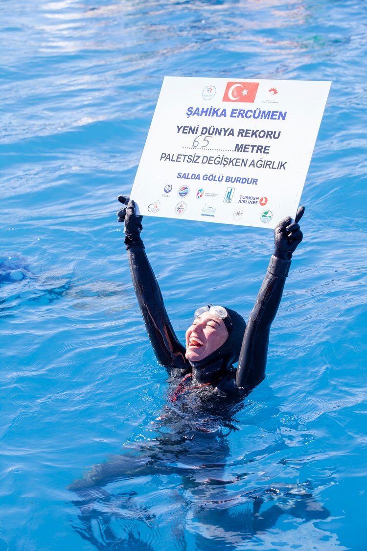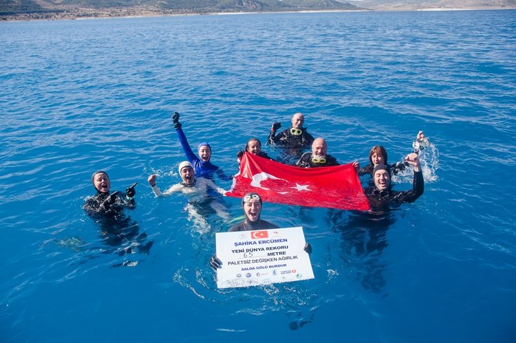 Şahika Ercümen, hava şartları nedeniyle planlanan günden bir gün sonra, 26 Ekim Cuma günü (bugün), Salda Gölü'nde gerçekleştirdiği dalışla dünya rekorunu kırdı. Sporcunun Dünya Sualtı Sporları Konfederasyonu uluslararası hakemleri tarafından tescillenen dünya rekoru, 1 dakika 58 saniye sürdü. Suyu çok soğuk olan, su sıcaklığı derinlerde 7 dereceye kadar düşen ve 1100 metre irtifada bulunan gölde rekor kırmayı başaran Ercümen'e rekor dalışında; su altında 8 kişi olmak üzere toplam 20 kişilik bir ekip eşlik etti.