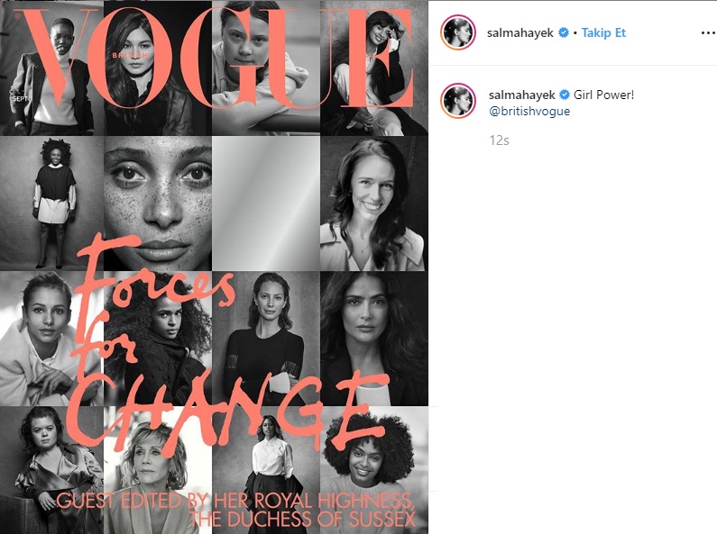 Bu kadınlardan biri de Meksika doğumlu Hollywood oyuncusu Salma Hayek oldu. Derginin Eylül 2019 sayısının kapağında yer alacak diğer isimler ise; Jane Fonda, ruh sağlığı alanında kampanyalar yapan model Adwoa Aboah, Orange Is the New Black dizisinin trans oyuncusu Laverne Cox, iklim değişikliği karşıtı kampanyalar düzenleyen Greta Thunberg ve Yeni Zelanda Başbakanı Jacinda Ardern.