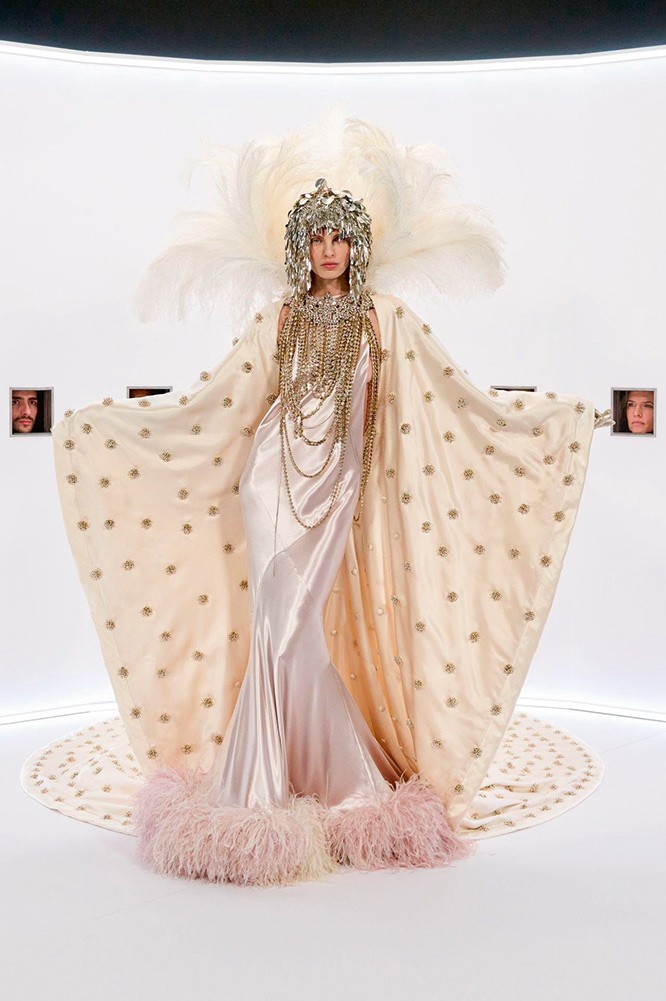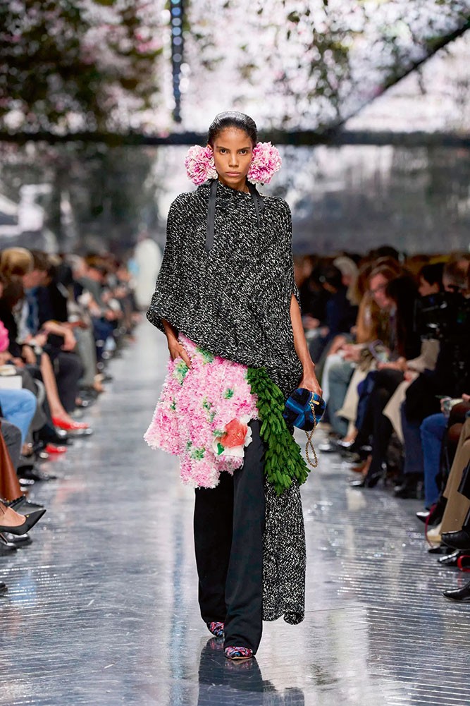 Matthieu Blazy, Chanel’de haute couture sahnesine ilk defa kendi vizyonuyla adım attı ve bu koleksiyon, klasik Chanel kodlarını hafifletip yeni bir zarafet diliyle yorumlamanın ötesine geçti. Geleneksel haute couture’un dramatik ağırlığını bilinçli olarak gevşeten Blazy, seyirciyi Grand Palais’i adeta büyülü bir ormana çeviren dev mantar ve pembe söğüt ağaçları arasında masalsı bir atmosferle karşıladı. Koleksiyonda kuş ve doğa motifleri sıkça karşımıza çıkıyor; bu sadece aksesuar değil, kumaş yüzeylerinde nakış, tüy detayları ve ince dokuma efektleri olarak yansıyor.