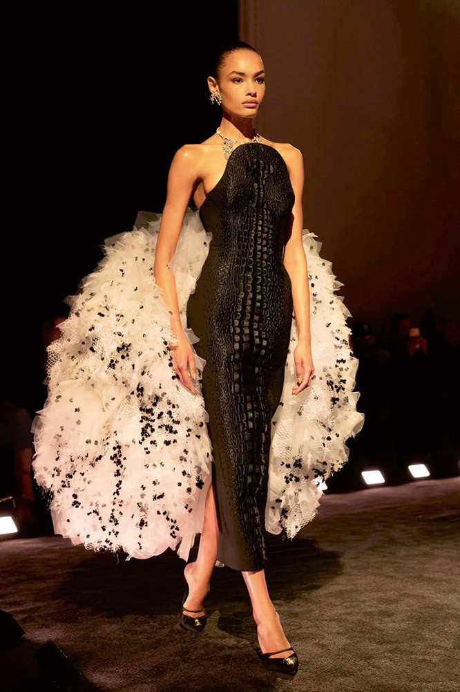 Elie Saab koleksiyonunda tanıdık bir his hakimdi. Saab, imzası olan görkemi bu kez daha modern bir dengeyle ele alıyor. Kıyafetlerde markanın vazgeçilmezi olan dantel ve payetler yine var, ancak daha hafif yerleştirilmiş. Elbiseler bedeni saran ama hareketi kısıtlamayan formlarda; omuzlar yumuşak, etekler akışkan. Şeff af katmanlar, derin yırtmaçlar ve ince drapeler Saab kadınının feminenliğini korurken onu daha güncel bir noktaya taşıyor.