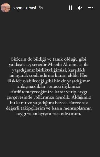 Şeyma Subaşı "Sizlerinde bildiği ve tanık olduğu gibi yaklaşık 1,5 senedir Meedo Alsaloussi ile yaşadığımız birlikteliğimizi karşılıklı anlaşarak sonlandırma kararı aldık. Her ilişkide olabileceği gibi biz de yaşadığımız anlaşmazlıklar sonucu ilişkimizi sürdüremeyeceğimize karar verip, saygı çerçevesinde yollarımızı ayırdık. Aldığımız bu karar ve yaşadığım hassas sürece siz değerli takipçilerim ve basın mensuplarından saygı ve anlayış rica ediyorum" dedi.