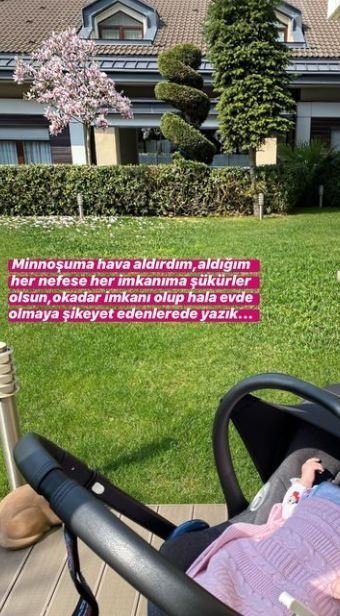 Sezin Erbil Yazgan, kızı Elisa'yı evinin bahçesinde hava aldırmaya çıkarttığı bir anı fotoğraflayarak sosyal medya hesabından paylaştı. Erbil fotoğrafında "Minnoşuma hava aldırdım. Aldığım her nefese, her imkanıma şükürler olsun. O kadar da imkanı olup, hala evde olmaya şikayet edenlere de yazık" ifadelerini kullandı.
