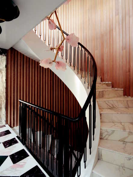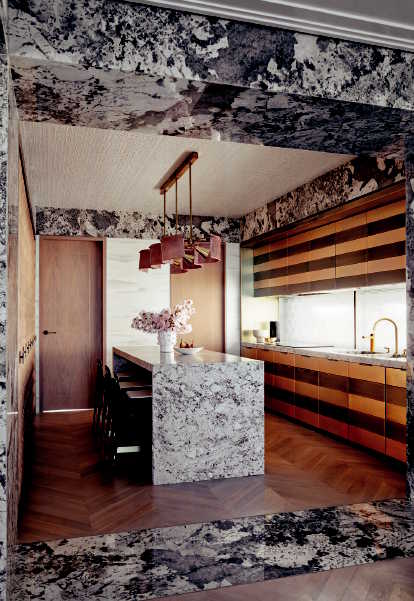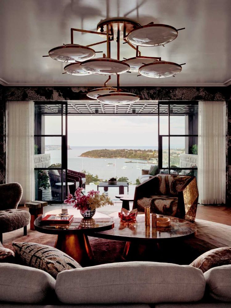 Mosman Limanı’nın panoromik manzarasına karşı konumlanan evde İç Mimar Greg Natale; klasizm, modernizmin ışığında Art Deco dokunuşları, brütalism detaylarının yanı sıra 28 farklı taş türü kullanarak muhteşem bir dekor yaratmış.