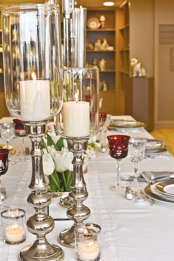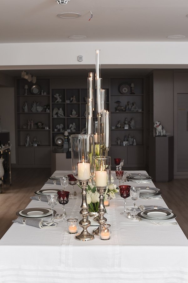 "BEYAZIN AĞIRLIKTA OLDUĞU MASADA BİRBİRİNE ÇOK YAKIŞTIĞI İÇİN GÜMÜŞ VE KIRMIZI TONLARINI KULLANDIK. KRİSTAL BARDAKLAR CRISTALLERIE DE MONTBRONN, YEMEK TAKIMLARI İSE BERNARDAUD İMZASI TAŞIYOR." S.K.