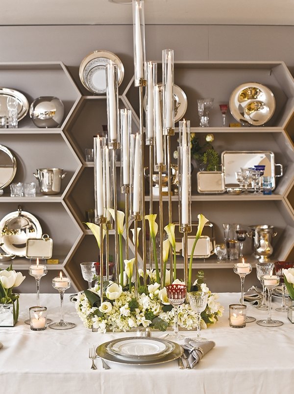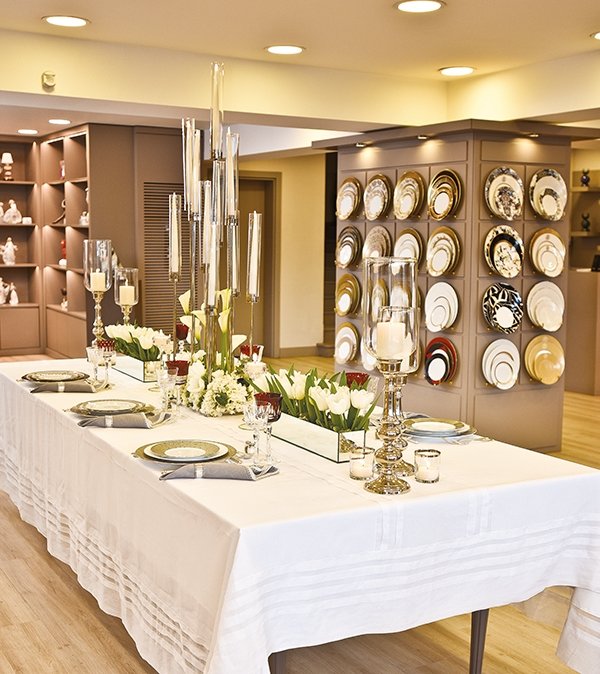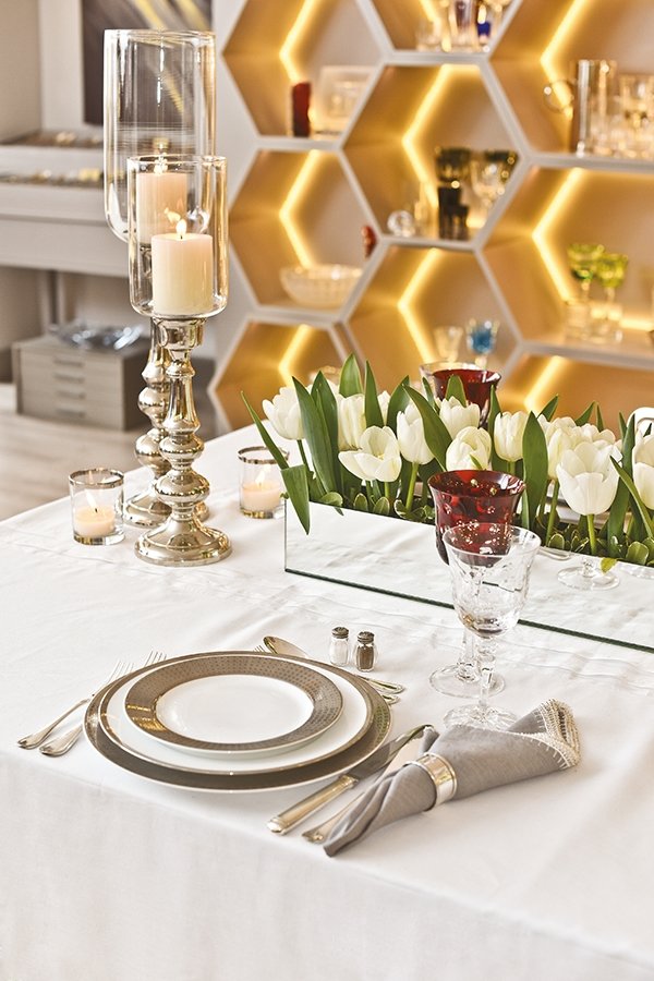 Prestige mağazasıyla 1987 yılından bu yana evlenenleri evlilik listesiyle tanıştıran, evlenmek üzere olan çiftlerin davetlilerine hediye seçimlerinde kusursuz hizmet sunan Stella ve Dalia Kant, Şamdan Plus okurları için şık bir salon düğününe uygun masa hazırladı. Stella Hanım, beyaz bir fon olmasını tercih ettikleri şık ve sofistike olarak tanımladıkları masalarını şu sözlerle anlatıyor: "Masamızda örtü olarak organza, çiçek olarak yine bu beyazlığı koruyacak lale ve kala kullandık. Çiçekler hem bahar düğününü çağrıştırıyor, hem de bu çiçeklerin asaletini, duruşunu çok beğeniyoruz. Kullandığımız yüksek mumlu objede lale ve kalayı birlikte kullandık, dikdörtgen ve alçak formlarda laleleri formlarını öne çıkarmak için tek başına kullanmayı uygun gördük. Araya da uzun, kısa mum dekorları serpiştirdik." Şık bir sofranın düzenlenmesi ve masayı şıklaştıran en önemli unsurun kullanılan yemek takımları, çatal, bıçak ve bardaklar olduğunu söyleyen Dalia Kant, bu masadaki tercihlerini ise şöyle sıraladı: "Yemek takımlarını genel konseptimize uyan beyaz, gümüş detaylı Bernardaud (Limoges) tasarımından yana kullandık. Gümüş, çatal bıçak takımlarımız Christofle, renk vermesi açısından tercih ettiğimiz kristal bardak takımları Cristallerie de Montbronn imzası taşıyor. Masa üstü aksesuarlarını Davet organizasyondan ve Haketa Home'dan tamamladık."