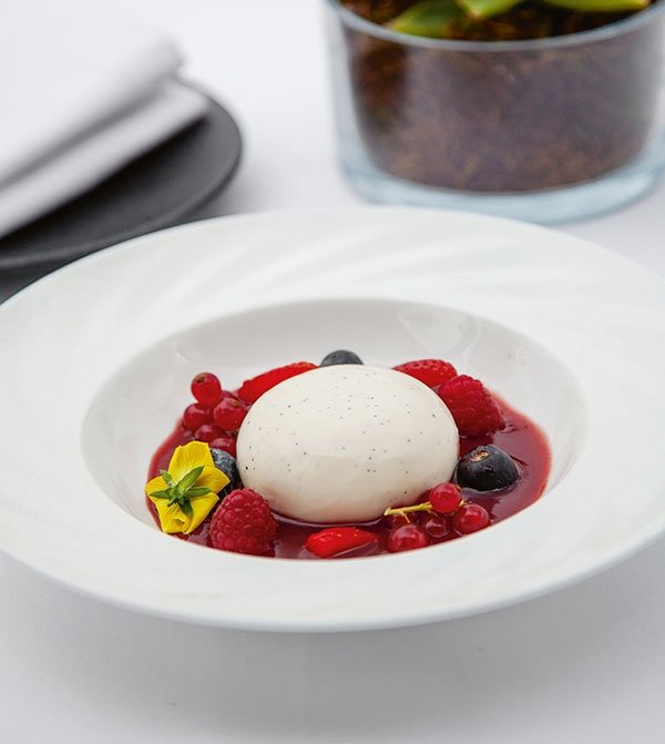 Krema ve vanilya çubuğunu çektirip jelatinle bağlıyor ve çilekli marmelat ve taze orman meyveleri ile servis ediyoruz.