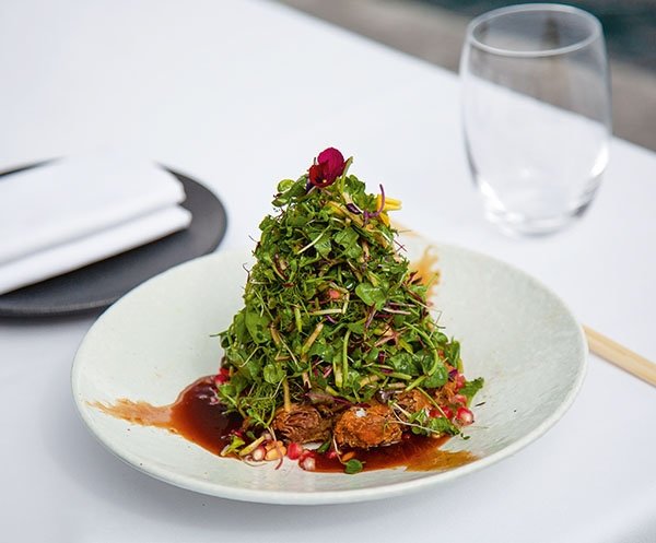 Ördeği pişirdikten sonra tiftikliyor ve paneleyip kızartıyoruz. Tatlı ekşi sosla marinelenmiş mikro filizlerle servis ediyoruz.