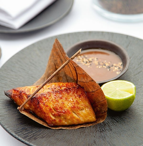 3 gün misoda marine edilmiş morina balığını ızgarada pişirip hoba yaprağına sarıyor, yuzu miso sos ile servis ediyoruz.
