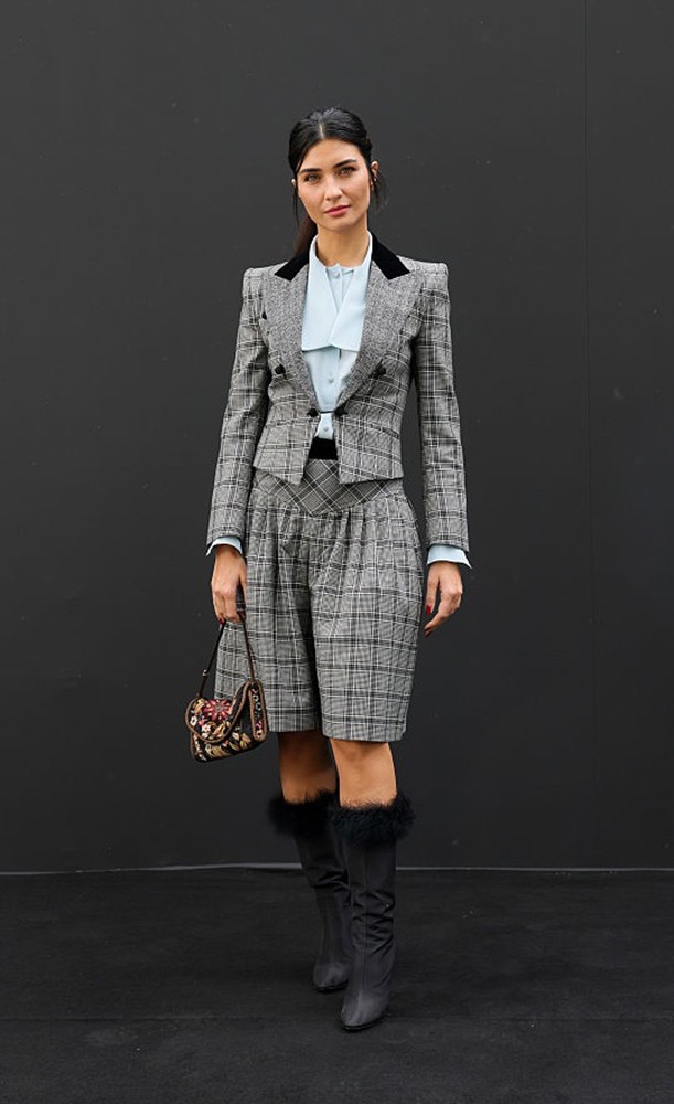 Ünlü oyuncu, ekose takımı, mavi gömleği ve kürk detaylı çizmeleriyle modern bir güç görünümü sergiledi.