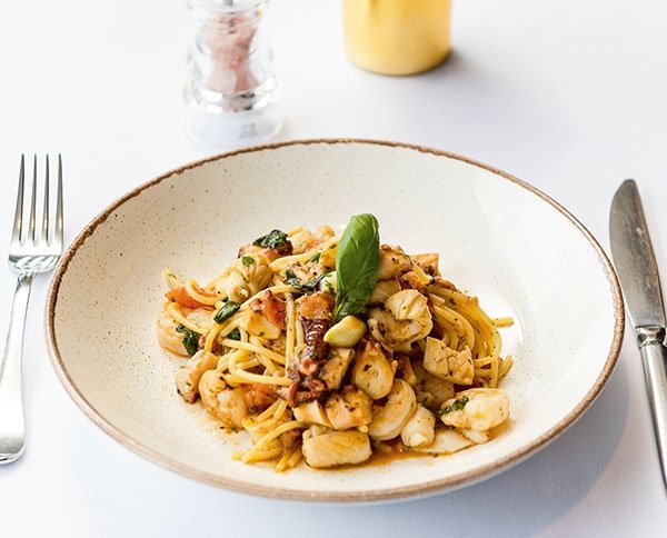 Karışık deniz ürünlü, kiraz domatesli spagetti